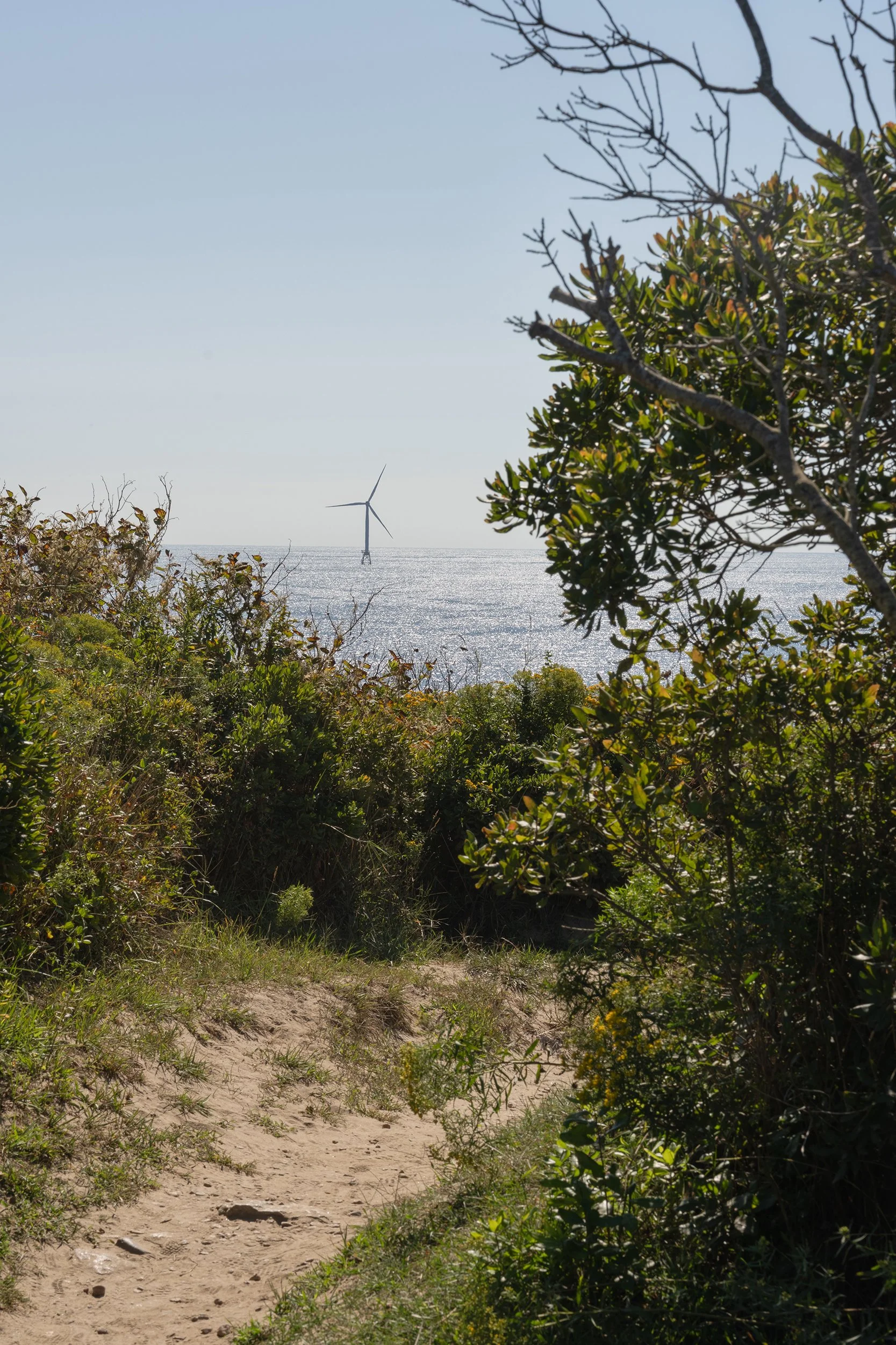 The Block Island Wind Farm visible from the Mohegan Bluffs. More than 40 percent of the land on Block Island is protected from development.