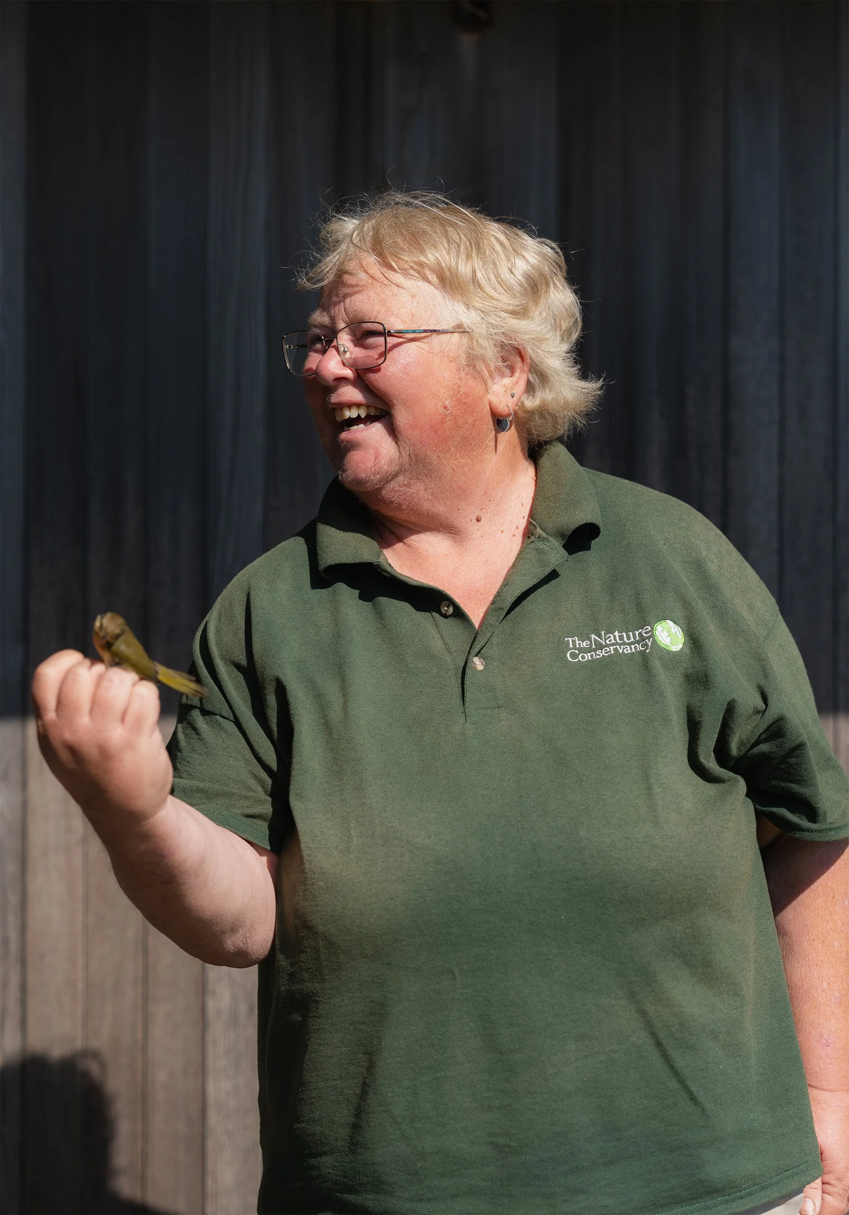 Kim Gaffett, a former head of the Town Council, and a bird she banded for conservation research.