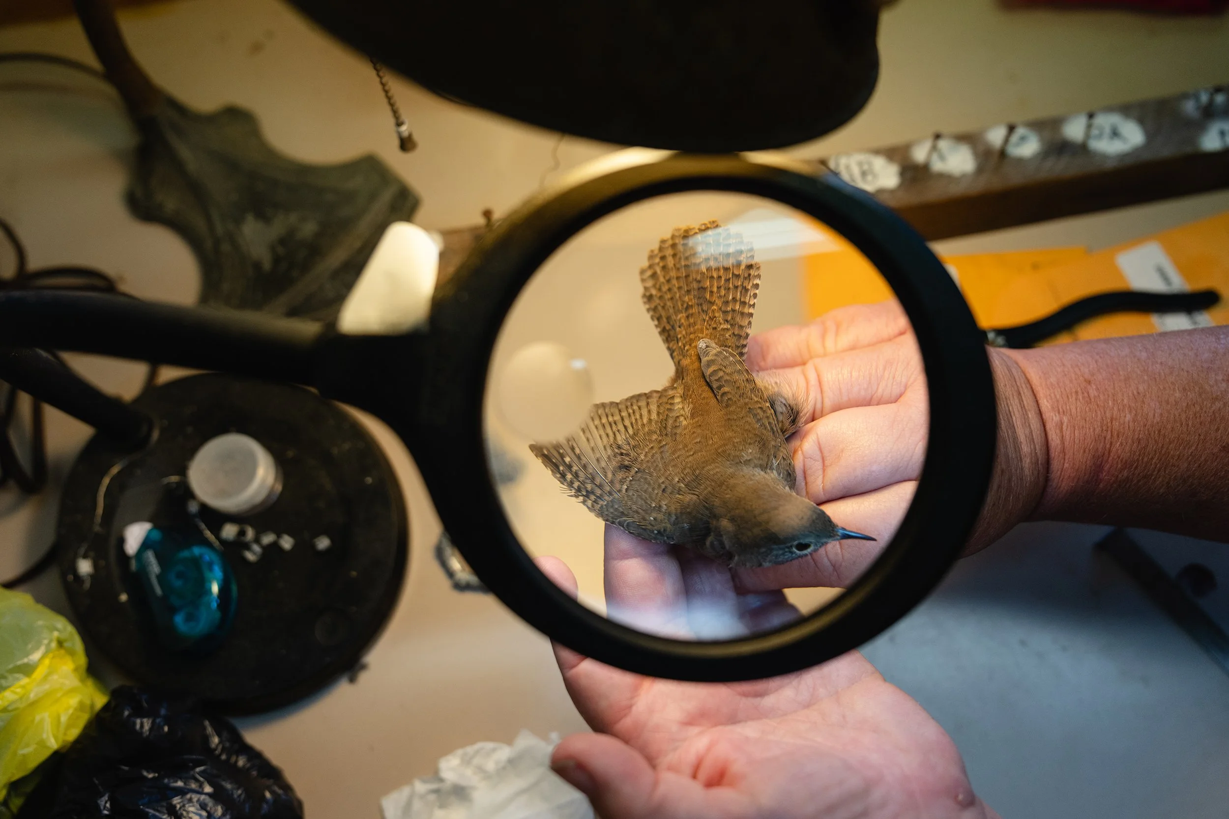 Kim Gaffett looks at a wren under the magnifying glass, at the Block Island Bird Banding Station. Gaffett is a supporter of the wind farm, despite claims by Donald Trump that offshore wind projects hurt birds and whales.